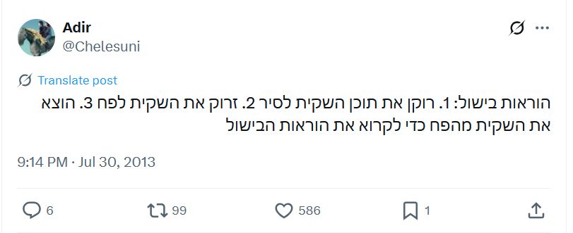 הוראות בישול: 1. רוקן את תוכן השקית לסיר 2. זרוק את השקית לפח 3. הוצא את השקית מהפח כדי לקרוא את הוראות הבישול